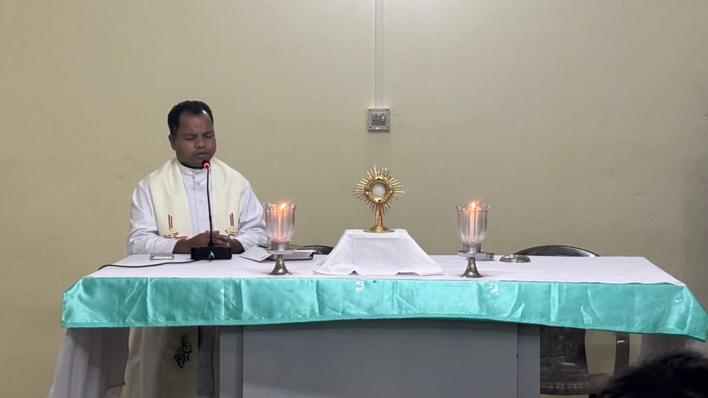Rev Fr Blasius Tete SDB animating the Eucharistic Adoration during the retreat of the clerics and brothers at Joropara.