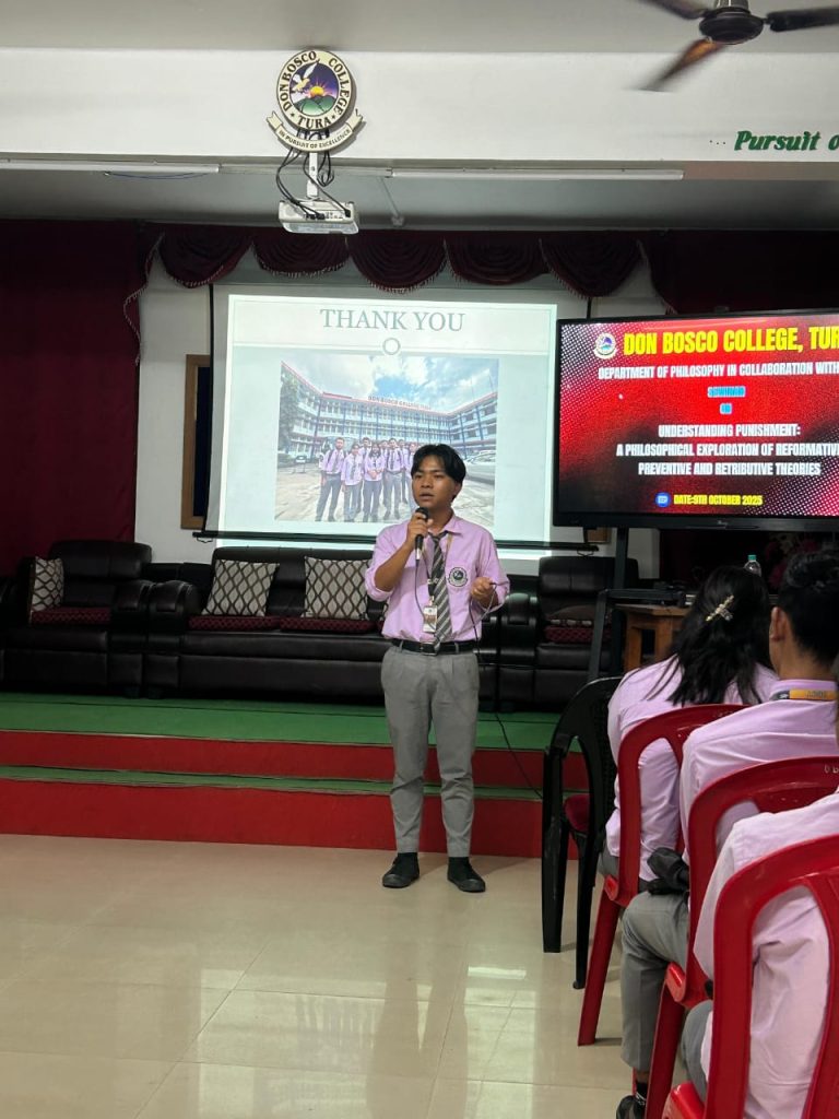 The Department of Philosophy, Don Bosco College, Tura, organized a departmental seminar for the 5th Semester Honours students on the theme “Understanding Punishment: A Philosophical Exploration of Reformative, Preventive and Retributive Theories” on 9th October 2025 at Bosco Hall. The seminar, which began at 11:00 a.m., saw the participation of 96 students, including Honours students from the first, third, and fifth semesters.