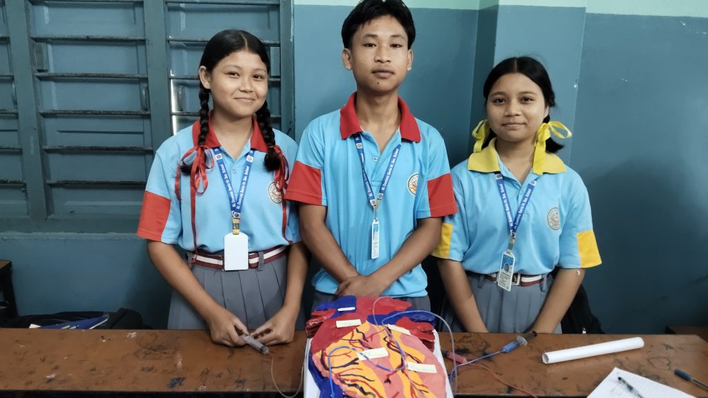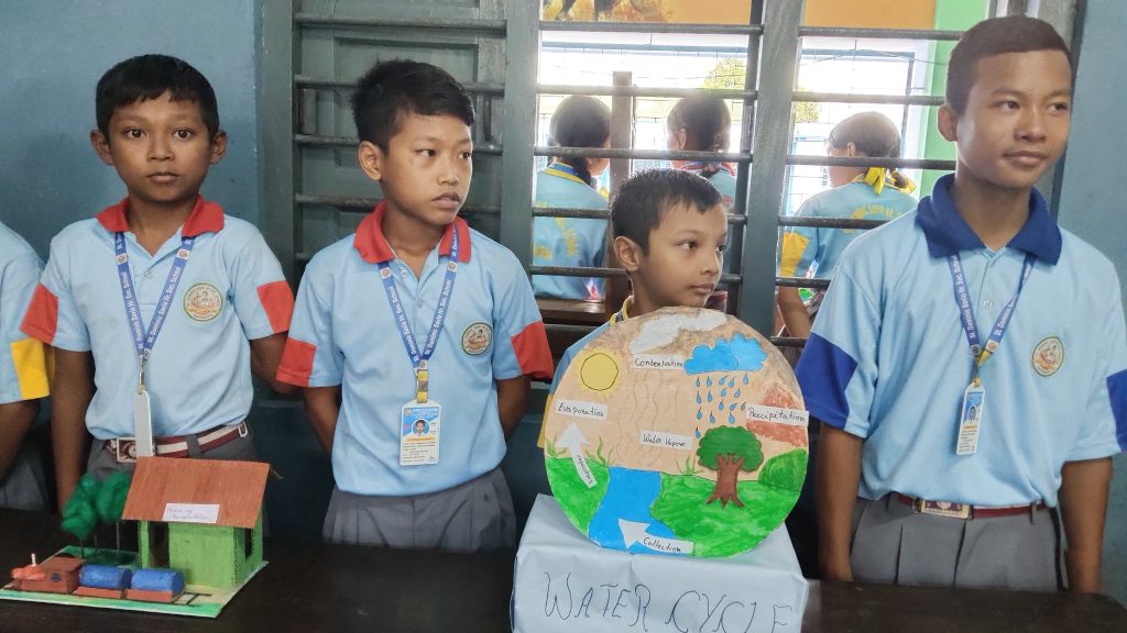 Students of St. Dominic Savio Higher Secondary School, Garobadha displaying their exhibit during the Arts, Crafts & Science Exhibition 2025.