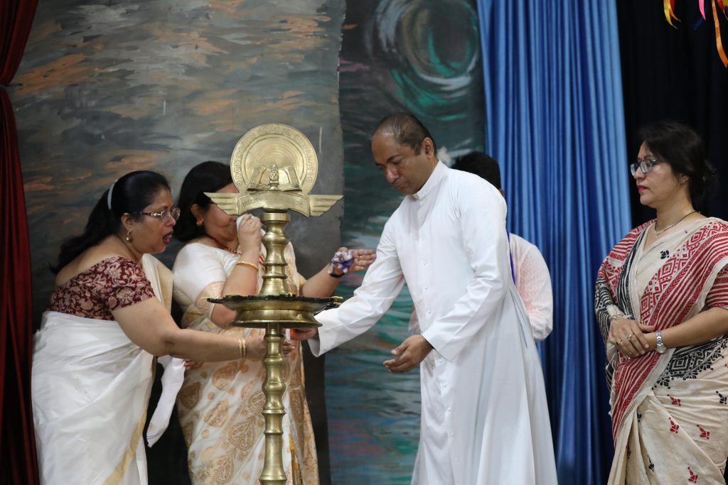 The programme began on a solemn note with Guru Vandana and Saraswati Vandana led by the school’s music teacher, Papu Gohain, followed by the lighting of the ceremonial lamp. The dignitaries present included Kusum Kunja Malakar, HoD and Associate Professor, Department of Hindi, Cotton University, who was the Chief Guest; Soumitram, Assistant Editor, Hindi Pratah Khabar; Fr. (Dr.) Alex Mathew SDB, Principal; Fr. Bromio Ch. Marak SDB, Vice Principal; Ms Mollika Sharma, Academic Coordinator; along with other senior teachers.