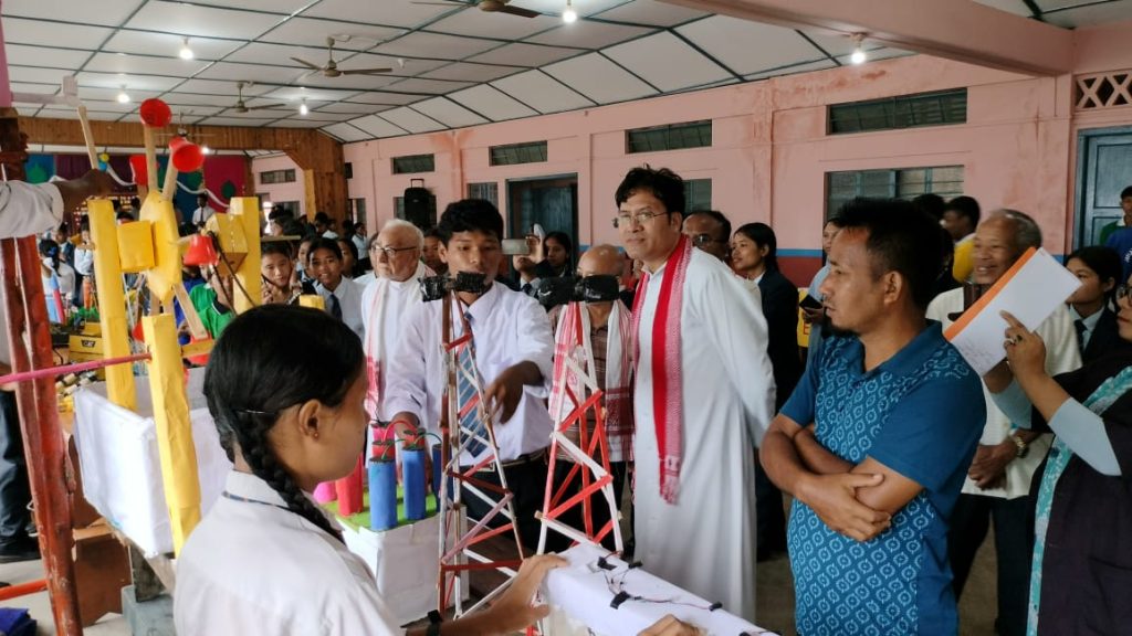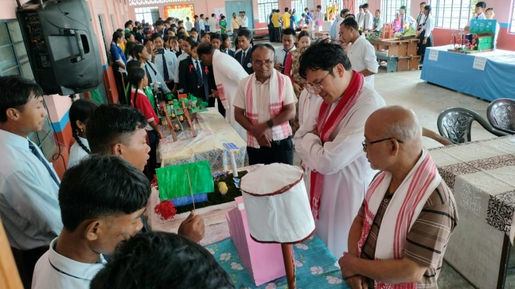 Rev Fr Bivan Rodriques Mukhim SDB, Vice Provincial and others listening to the explanation by students at the Science Exhibition held at Joplang Secondary School, Shallang.