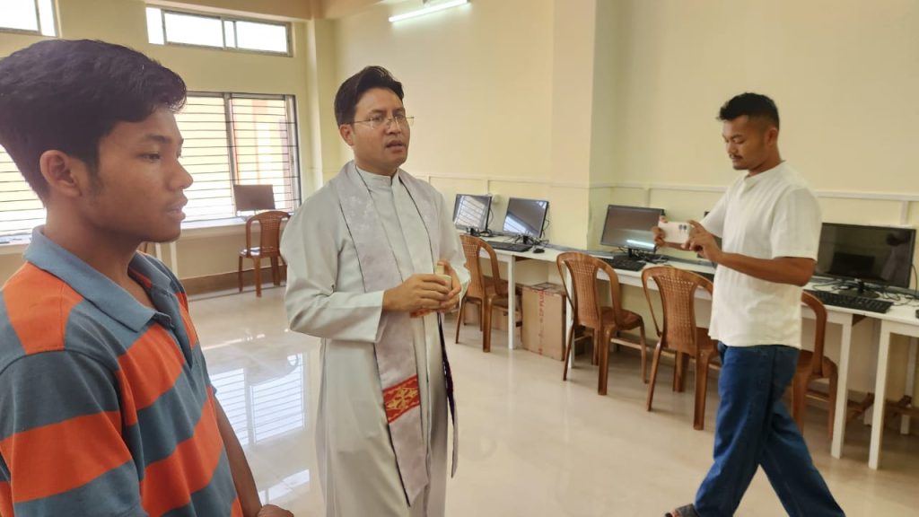 Rev. Fr. Bivan Rodrigues Mukhim, SDB, Vice Provincial of the Salesian Province of Guwahati blesses the new computers at Don Bosco Green Skill Institute, Jorapara.