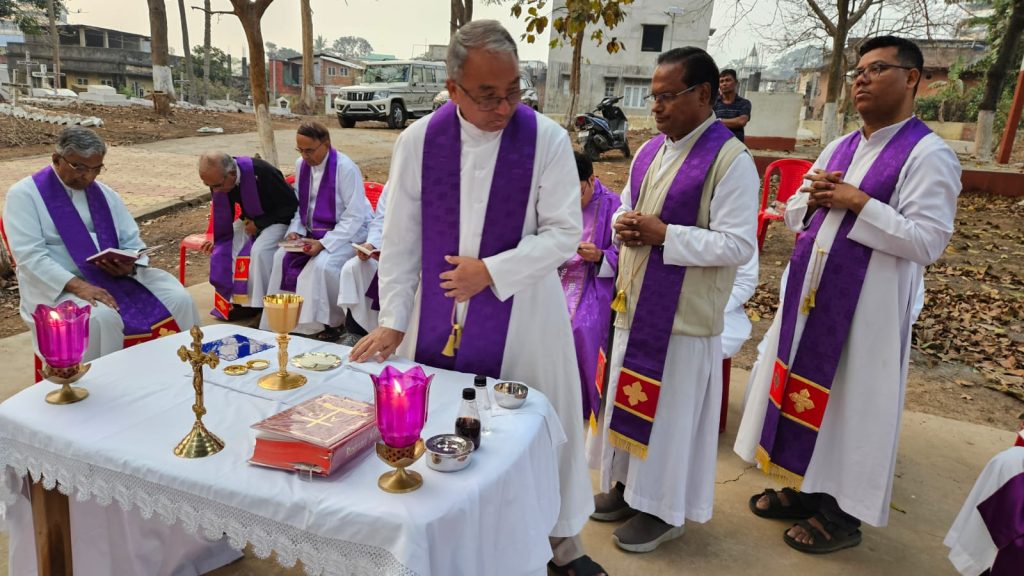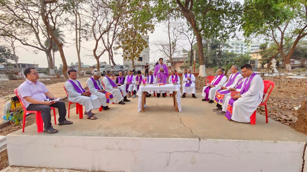The Provincial House Community, along with the neighbouring Salesian communities of Guwahati, gathered at the Uzanbazar Christian Cemetery on 22nd March 2025 for a Holy Mass to pray for the soul of Late Rev Bro Angelus Tete SDB on his first death anniversary. The Holy Mass was presided over by Rev Fr Bivan Rodrigues Mukhim SDB, Vice Provincial, and concelebrated by fifteen Salesians from different communities in Guwahati.