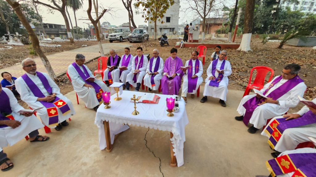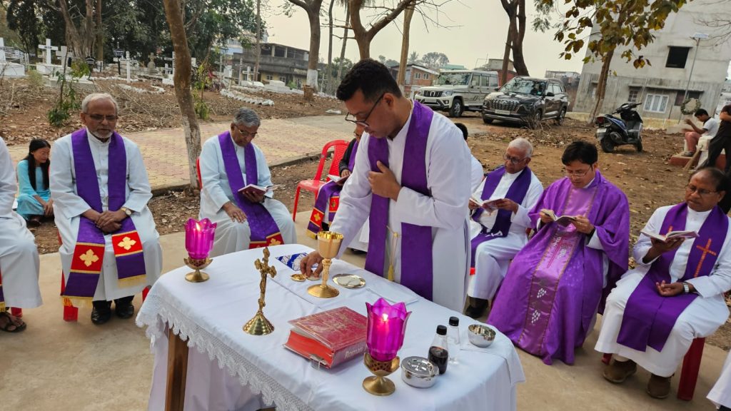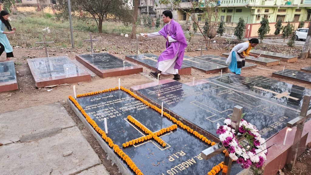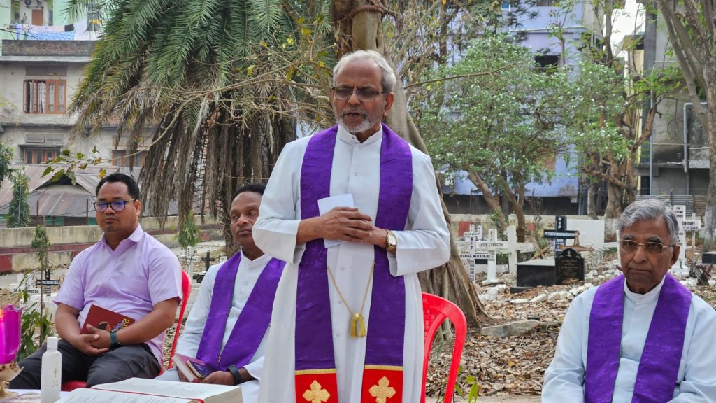 Salesians gathered at the Uzanbazar Christian Cemetery on 22nd March 2025 for a Holy Mass to pray for the soul of Late Rev Bro Angelus Tete SDB .