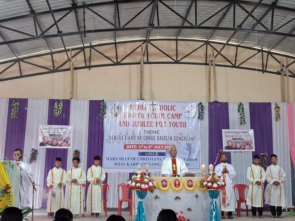 The A•chik Catholic Summer Youth Camp and the Jubilee for Youth of Mary Help of Christians Church, Satgaon, came to a graceful conclusion on Sunday, July 6, 2025. The high note of the grand finale was a solemn Eucharistic celebration in the packed parish auditorium and the symbolic lowering of the youth flag, outdoors.