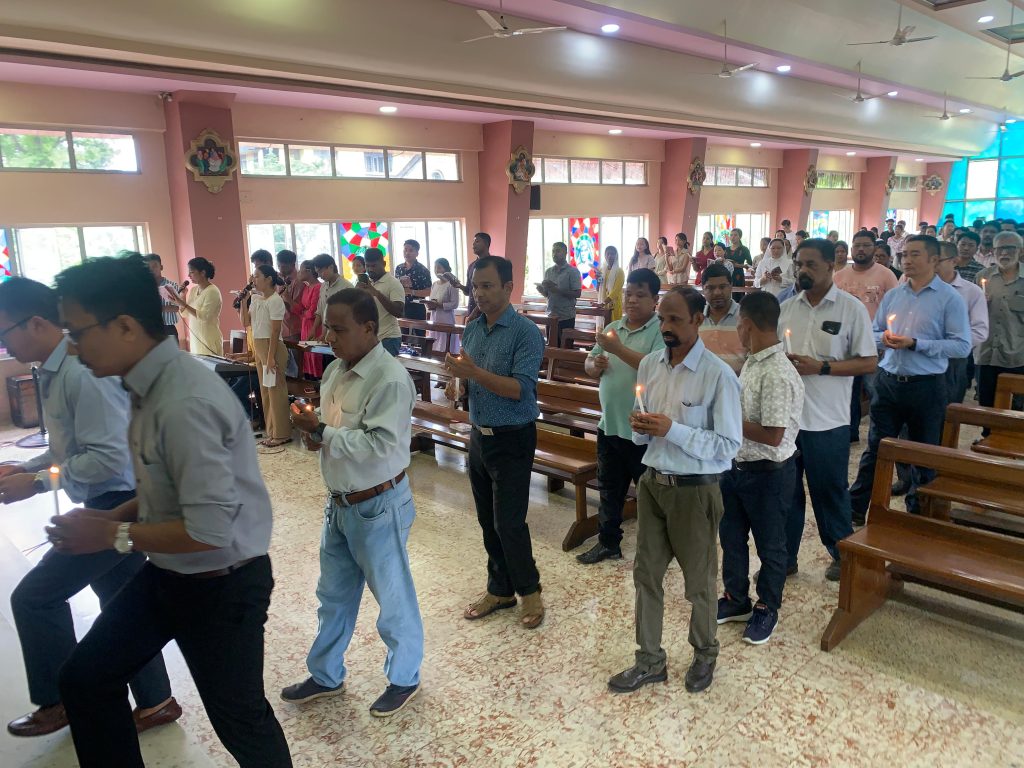 The Holy Eucharist was presided over by the Parish Priest, Rev. Fr. Vincent Xalxo, SDB, with several other priests concelebrating. The liturgy began with a touching entrance procession, during which the fathers came forward reverently with lighted candles, symbolizing their commitment to guiding their families in the light of Christ. These candles were then offered at the altar, marking a moment of deep spiritual significance.